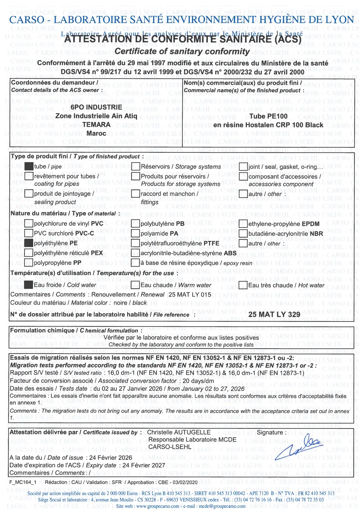 Domaine d’application : Les tubes en PEHD, destinés à l’adduction et la distribution de l’eau potable, les gaz et les liquides industriels sous pression nominale de 06, 10, 16,20 et 25 bars.