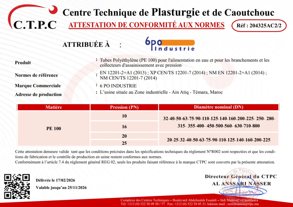Créée en 1996 et opérationnelle depuis 1999, «6PO Industrie» est une société spécialisée dans l’extrusion des tubes en Polychlorure de Vinyle (PVC) et en Polyéthylène (PEHD),de diamètres et de pressions nominales différents destinés à la distribution d’eau potable, d’assainissement, de l’irrigation, de Télécommunication et d'évacuation .