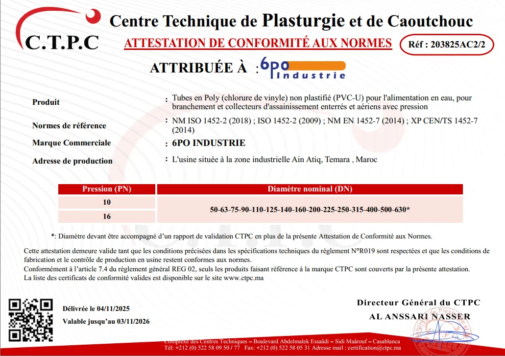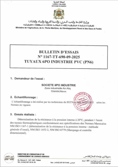 Domaine d’application : Les tubes en PVC non plastifié, destinés à la conduite des liquides sous pression nominale de 06, 10, 16 et 25 bars et pression instantanée de 25, 40, 60 et 100 bars.